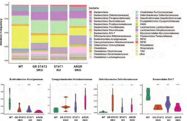 越來(lái)越多的證據(jù)表明,存在于粘膜表面的共生腸道微生物區(qū)系在塑造宿主免疫系統(tǒng)方面也起著重要作用。然而,對(duì)微生物組和IFN之間相互作用對(duì)預(yù)防發(fā)病機(jī)制的重要性的理解有限。在這里,作者揭示了STAT1在控制微生物生態(tài)中的作用,該微生物生態(tài)可防止炎癥并在沒(méi)有感染性挑戰(zhàn)的情況下維持免疫穩(wěn)態(tài)。該研究表明,通過(guò)其共同介質(zhì)STAT1起作用的通過(guò)IFN途徑的強(qiáng)直信號(hào)傳導(dǎo)是免疫穩(wěn)態(tài)的必需調(diào)節(jié)劑,降低了炎癥傾向。這種強(qiáng)直性IFN信號(hào)似乎涉及所有三個(gè)主要的IFN家族,因?yàn)橥返乃腥齻€(gè)分支的缺失是完整的炎癥表型所必需的。缺乏緊張性干擾素信號(hào)可以形成扭曲的微生物群,從而觸發(fā)炎癥反應(yīng),這可能是由于TH17細(xì)胞對(duì)致病表型的偏向增加,以及外周Treg的歸巢或存活受損所致。